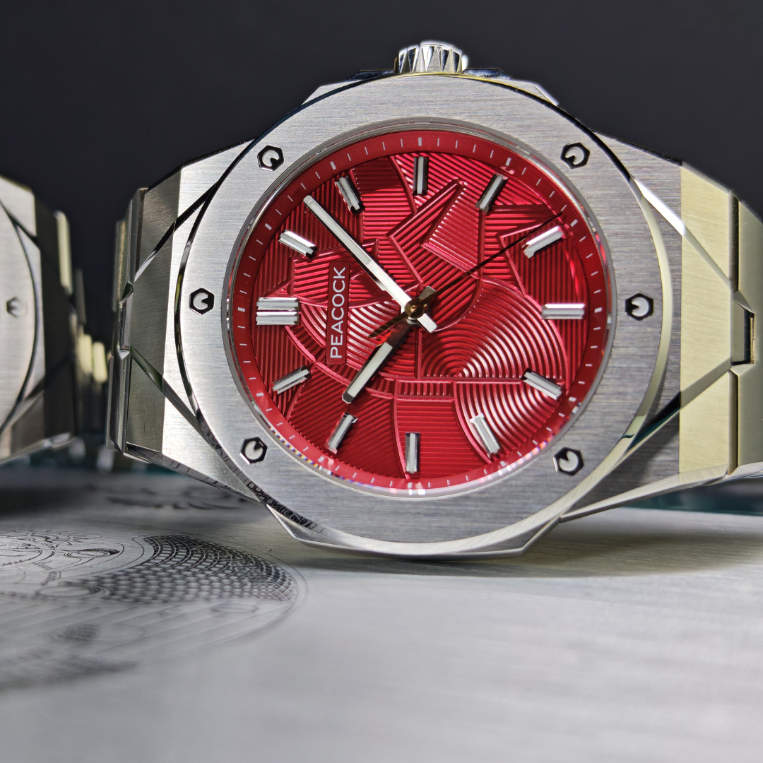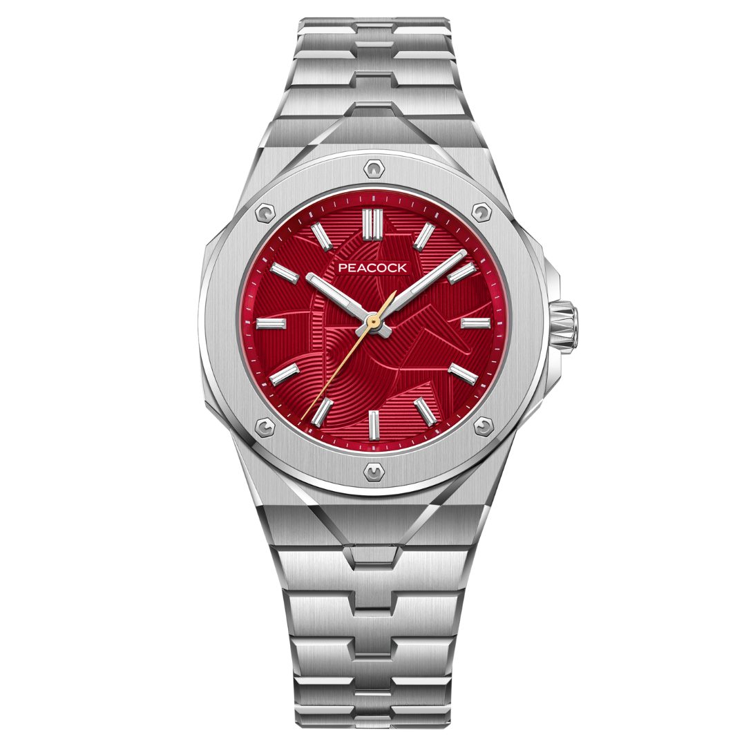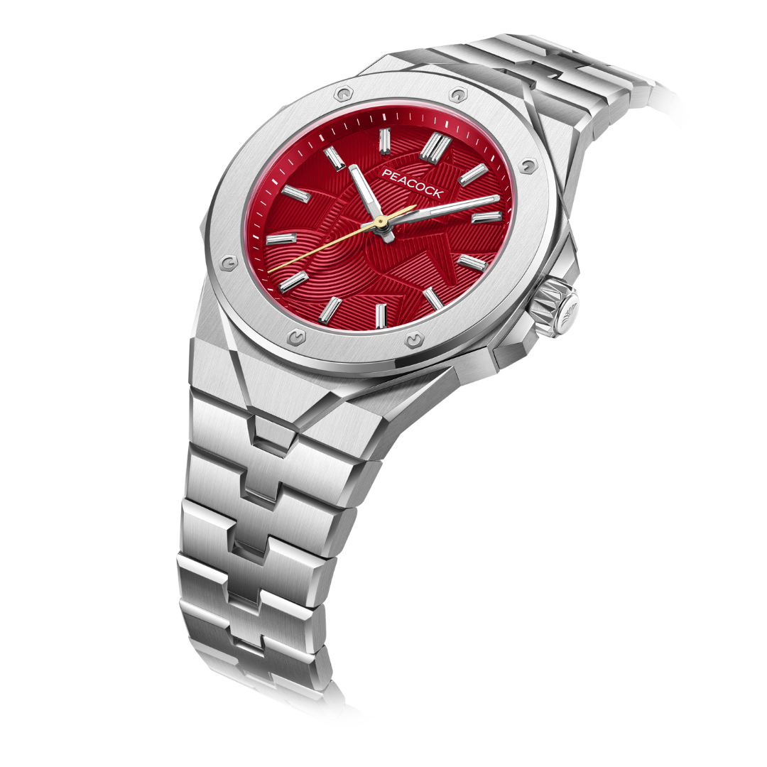 The watch is powered by Peacock's in-house manual-wind mechanical movement, presenting time with a classic three-hand design. The case is crafted from 904L aerospace-grade steel, incorporating modern geometric cutting techniques to form a striking multi-dimensional structure. The case and bracelet adopt an integrated design, combining brushed, mirror, and matte finishes for a rich interplay of light. The case back is engraved with a three-dimensional "Dragon Horse" motif from the Western Han Dynasty, symbolizing auspiciousness with every turn.
