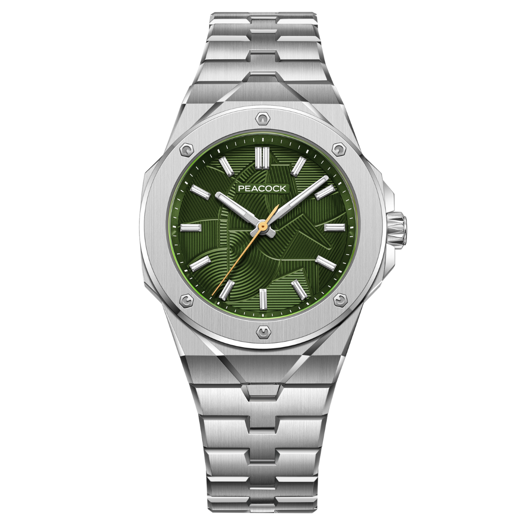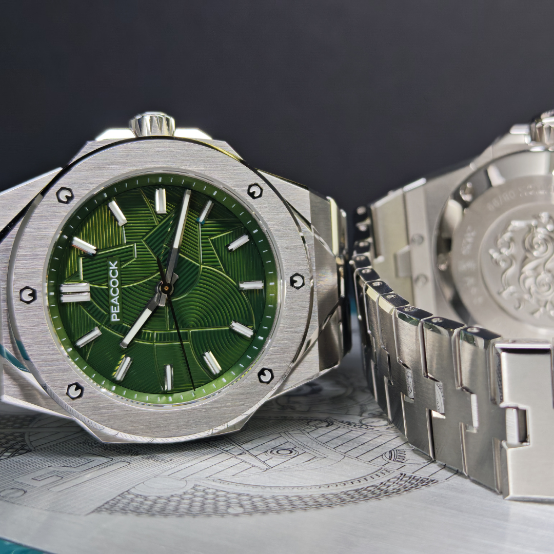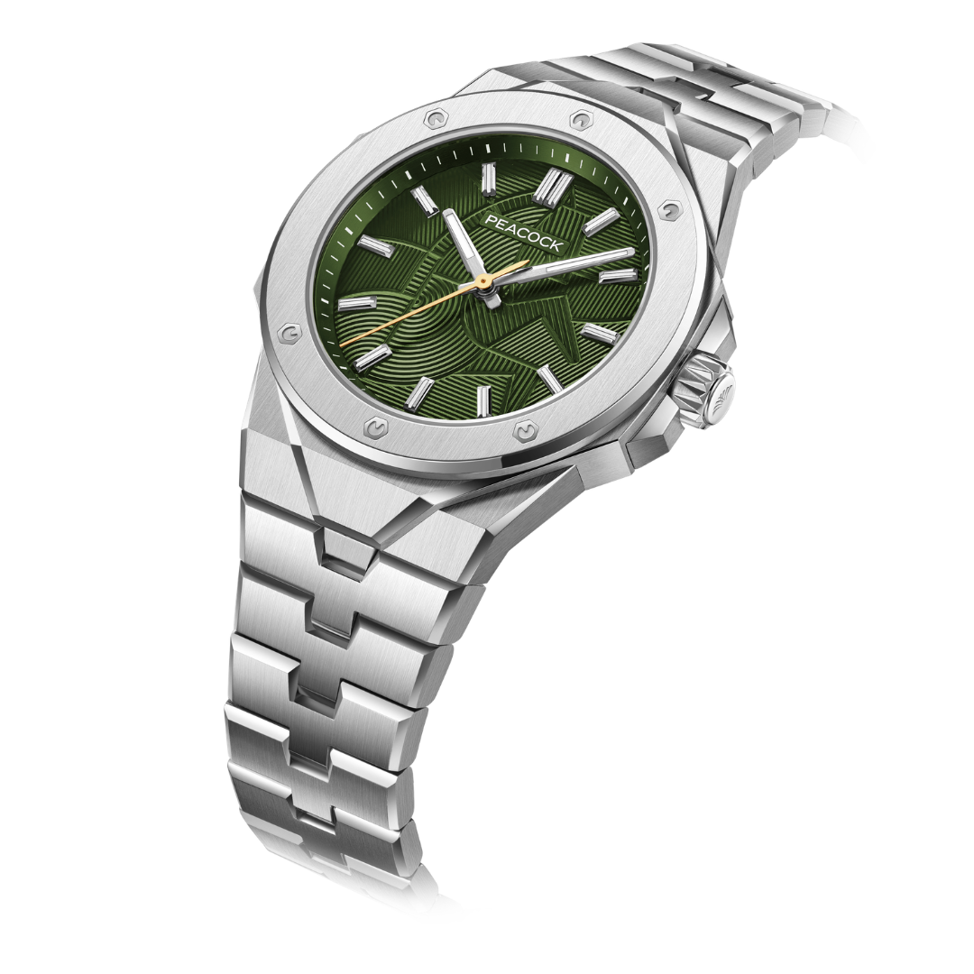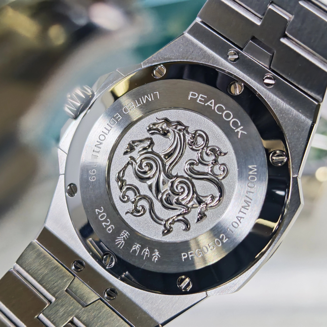 The watch is powered by Peacock's in-house manual-wind mechanical movement, presenting time with a classic three-hand design. The case is crafted from 904L aerospace-grade steel, incorporating modern geometric cutting techniques to form a striking multi-dimensional structure. The case and bracelet adopt an integrated design, combining brushed, mirror, and matte finishes for a rich interplay of light. The case back is engraved with a three-dimensional "Dragon Horse" motif from the Western Han Dynasty, symbolizing auspiciousness with every turn.