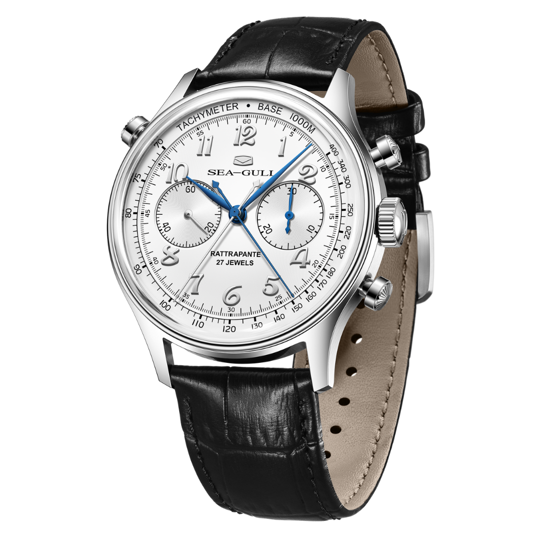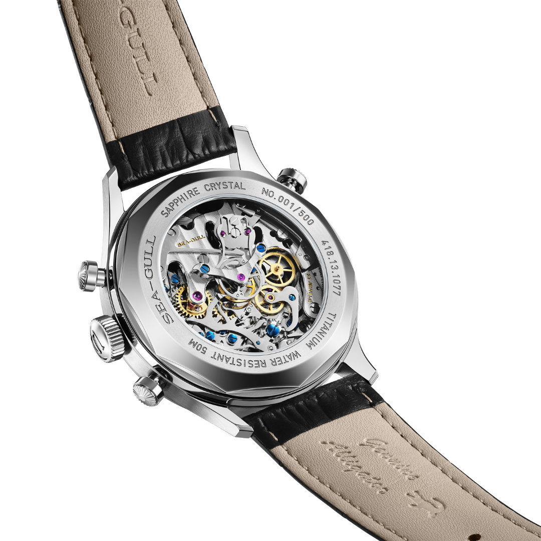 Mechanical, manual-winding. China Made. Caliber: Sea-Gull ST1961. Hand-polished Geneva stripes. Functions: Hour, minute, second, split-seconds chronograph, tachymeter (Central hour, minute and chronograph seconds hands, small seconds hand at 9 o'clock, 30-minute counter at 3 o'clock. Tachymeter scales on dial edge.). Jewels: 27. Power reserve: Around 45 hours.