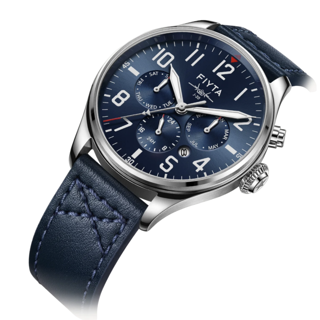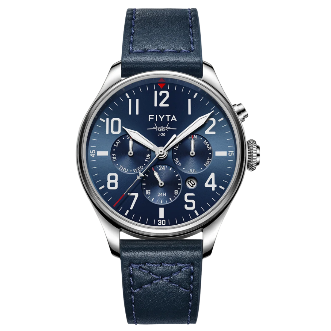 - Dial: Horizon blue, sunburst finish; J-20 outline drawing; Arabic numeral hour markers (luminous); Date window at 3 o'clock, day window at 4 o'clock, 24-hour dial at 6 o'clock, day of the week dial at 9 o'clock