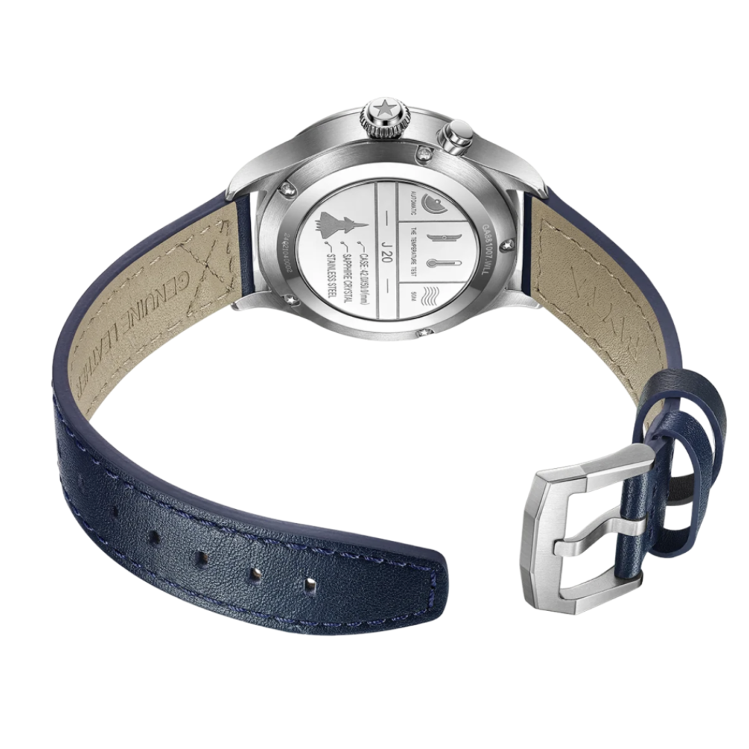 - Strap: Horizon blue, calf leather; with blue stitching on both sides