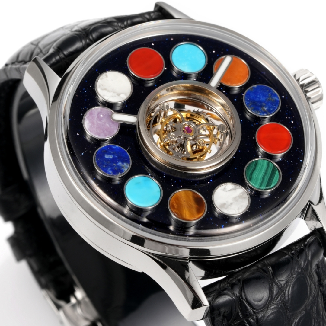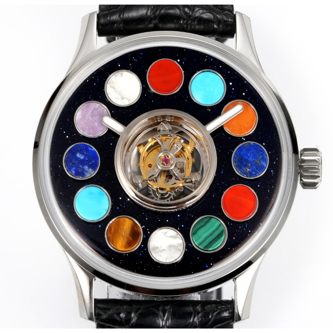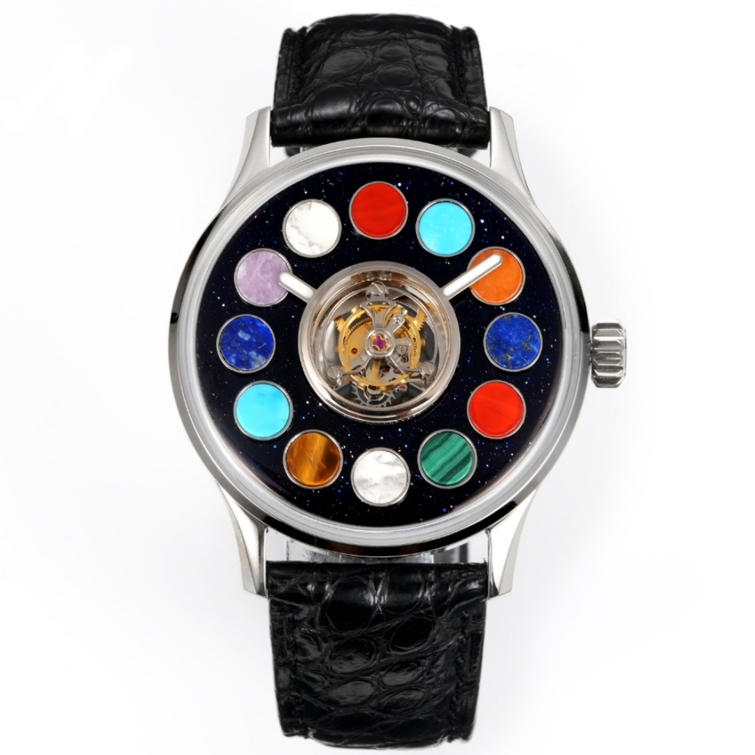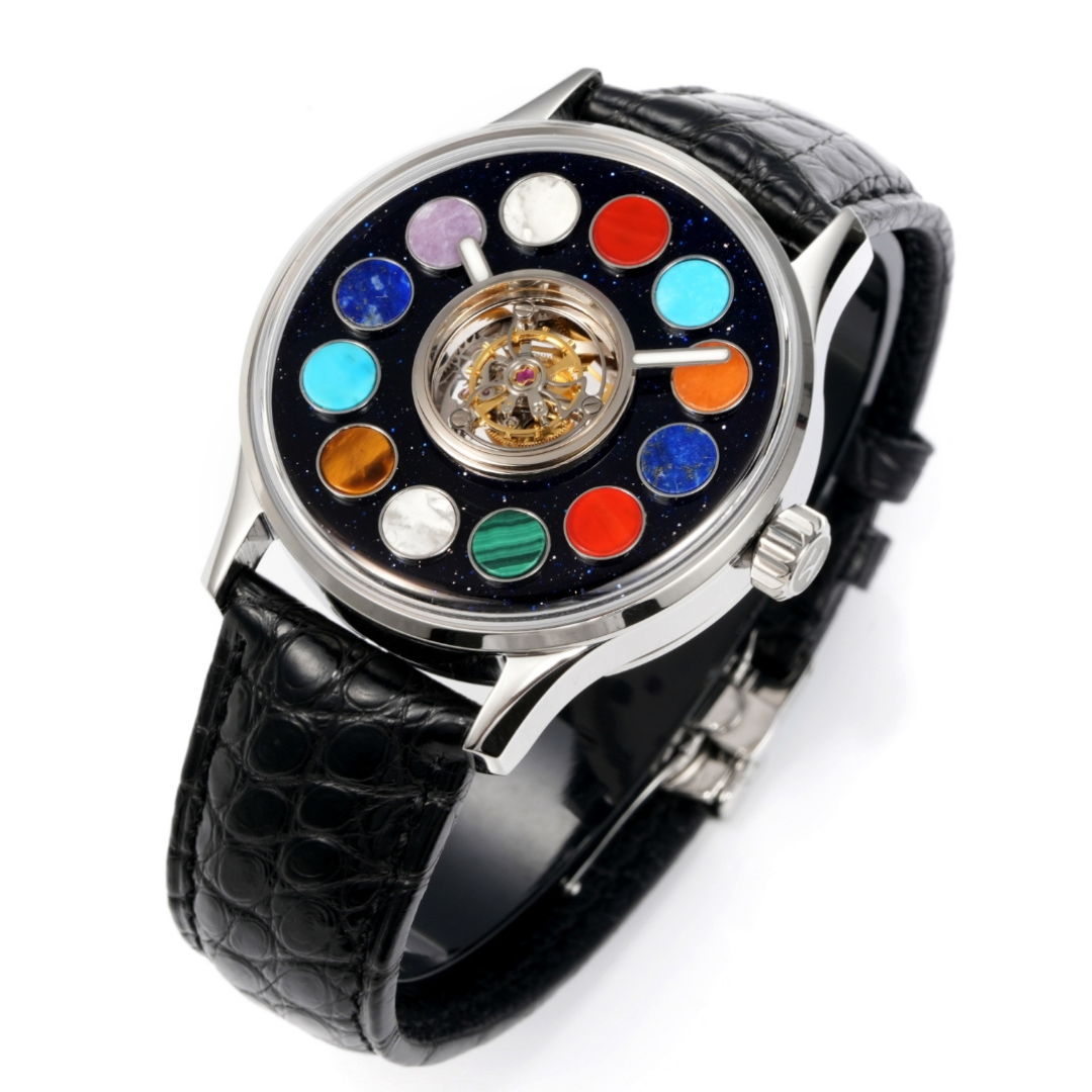 HUADSUO debuts its first tourbillon watch series. The "Crown of Kings Series" takes the planets of the universe as its theme, integrating the characteristics of natural stones into the tourbillon craftsmanship. The timepiece is powered by a Peacock manual-winding central tourbillon movement. The base layer of the dial uses blue sandstone, and incorporates a total of 8 different types of natural stones—including turquoise, Huangling stone, lapis lazuli, malachite, howlite, tiger's eye, and purple mica—arranged around the central tourbillon, creating a starry, colorful cosmic space.