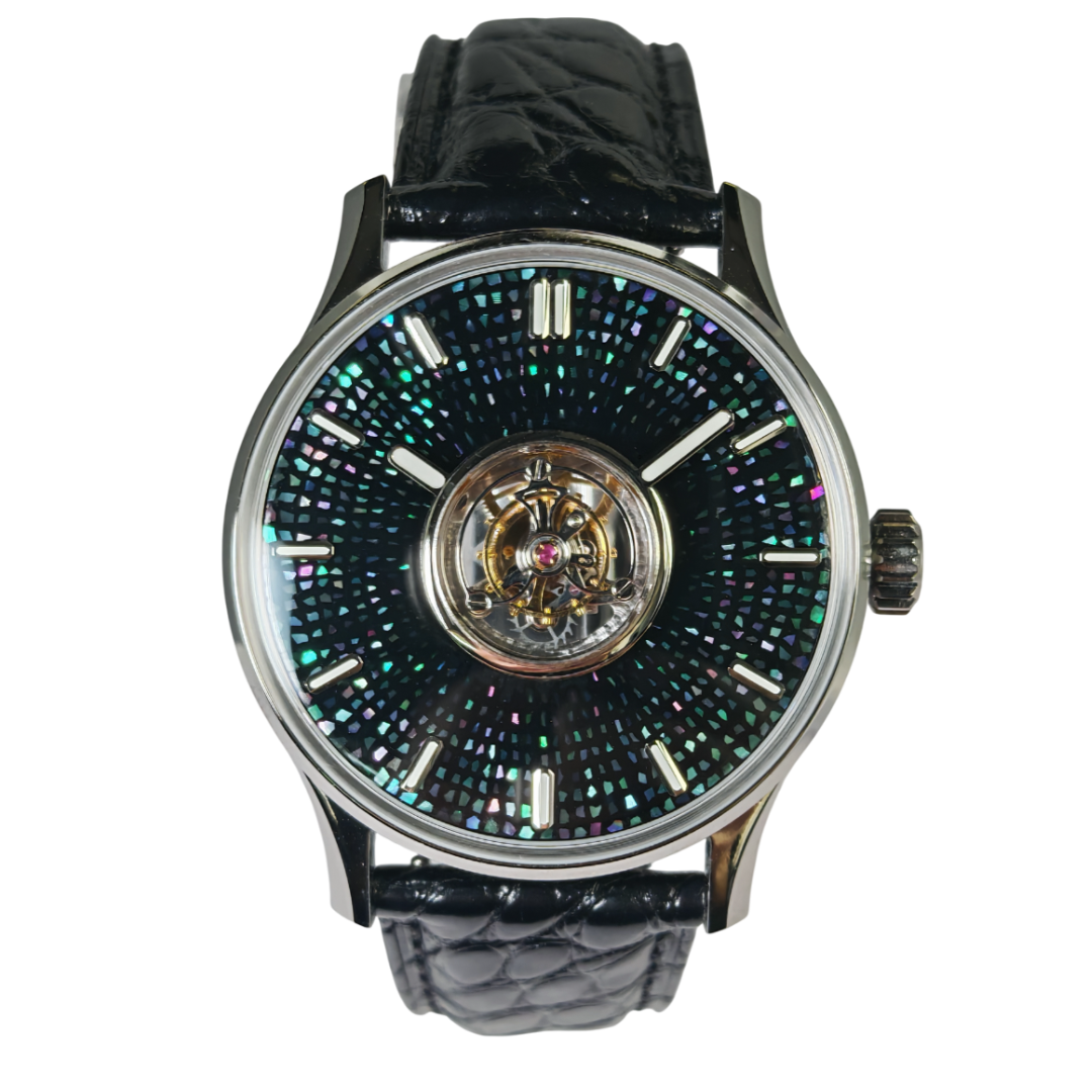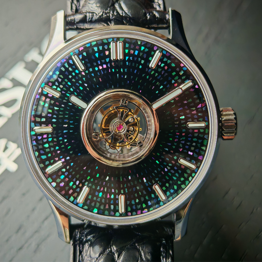The dial is adorned with a total of 560 pieces of mother-of-pearl, each hand-inlaid by master watchmakers, emitting the distinctive silvery-purple iridescence of the mother-of-pearl technique. The timepiece is powered by the Peacock SL5711 manual-winding central tourbillon movement, featuring a four-mainspring barrel design that provides an impressive power reserve of up to 120 hours. Limited edition release.