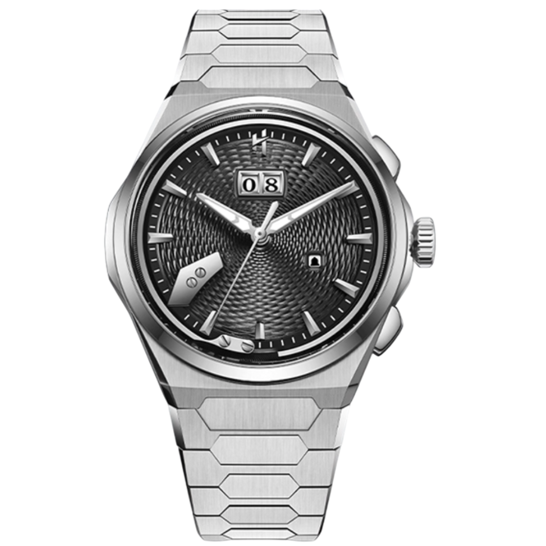 The dial is engraved with a guilloché wheat-grain pattern. As the hour arrives, a visual hammer strikes a circular reed, allowing the wearer to appreciate the mechanical beauty of the self-chiming function in action. Both the case and the integrated bracelet are crafted from Grade 5 titanium. A large date adjustment button is positioned at 12 o’clock, with a chime on/off switch located below for easy operation. The case back is fitted with a newly designed automatic rotor and features a transparent display.