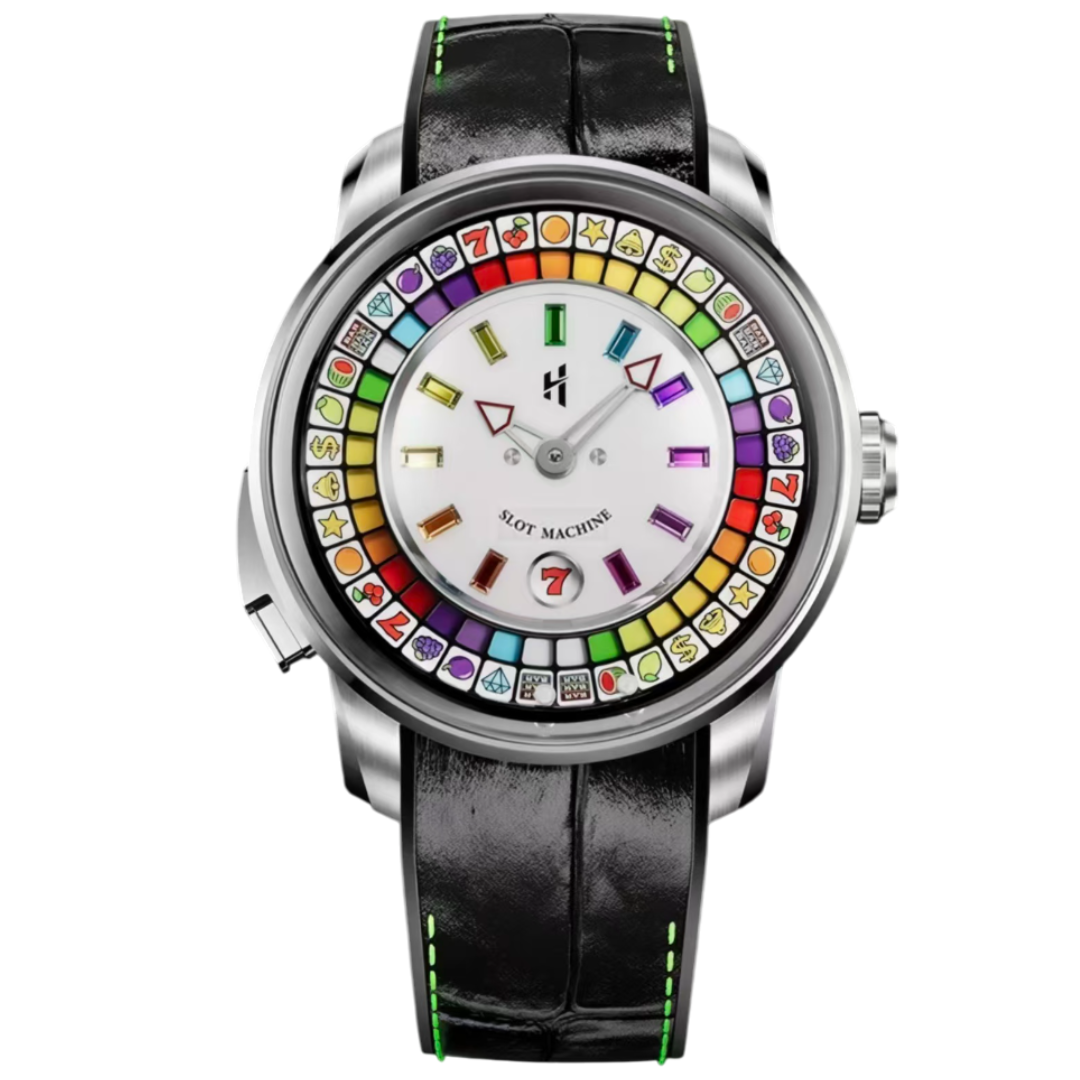 The dial features a reel with 12 distinct symbols, faithfully recreating the classic arcade action. With a simple press of the button, the specially engineered Lucky Harvey movement activates, setting two rolling beads and the window at 6 o'clock spinning simultaneously. Victory is declared when all three elements align on the same symbol. The hour markers are adorned with 11 vibrant colored gemstones that burst with scintillating color. The case back is engraved with exclusive gameplay icons and comes paired with a dual-sided leather and fluoro rubber strap. Available in three color variations, each limited to just 100 pieces.