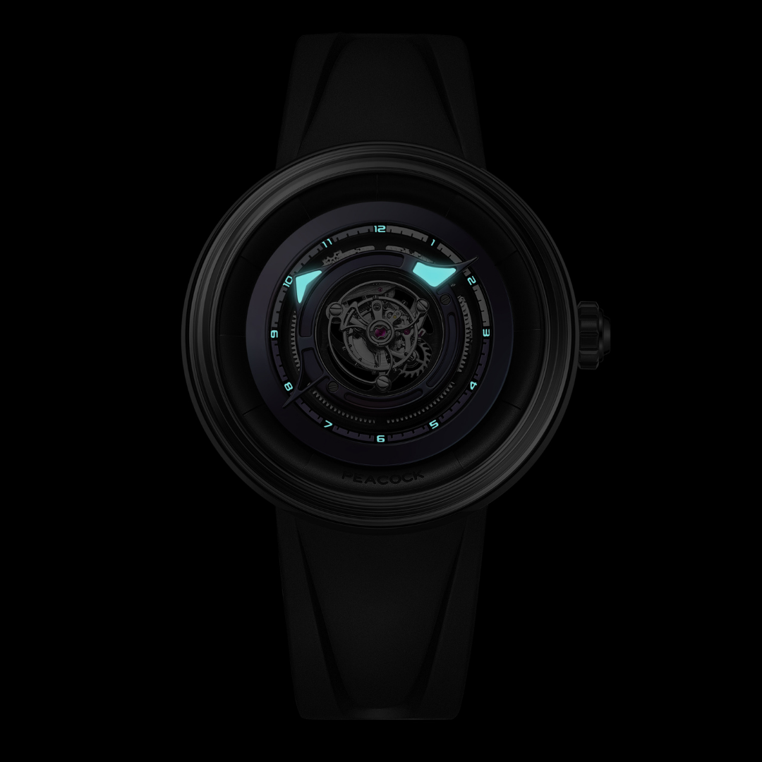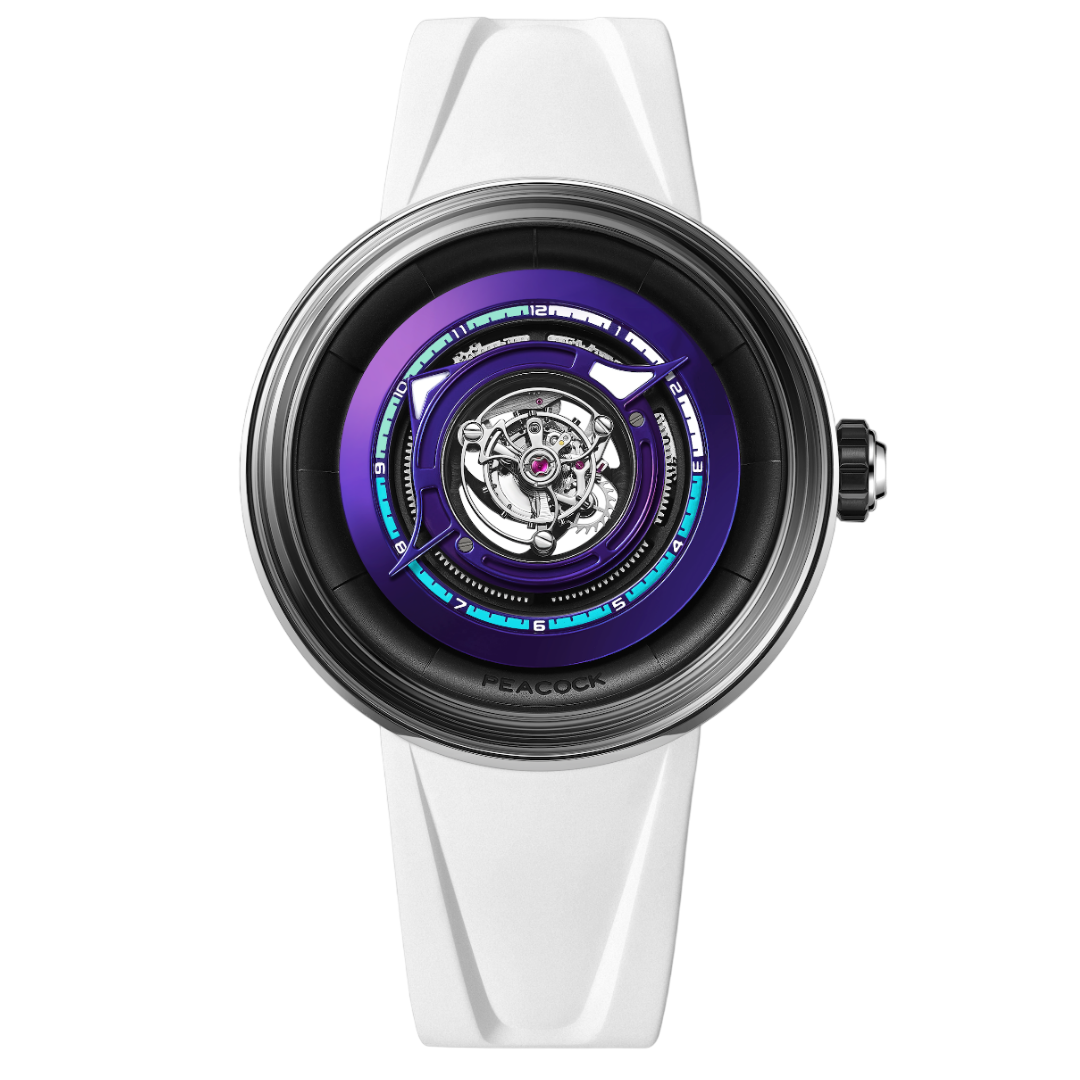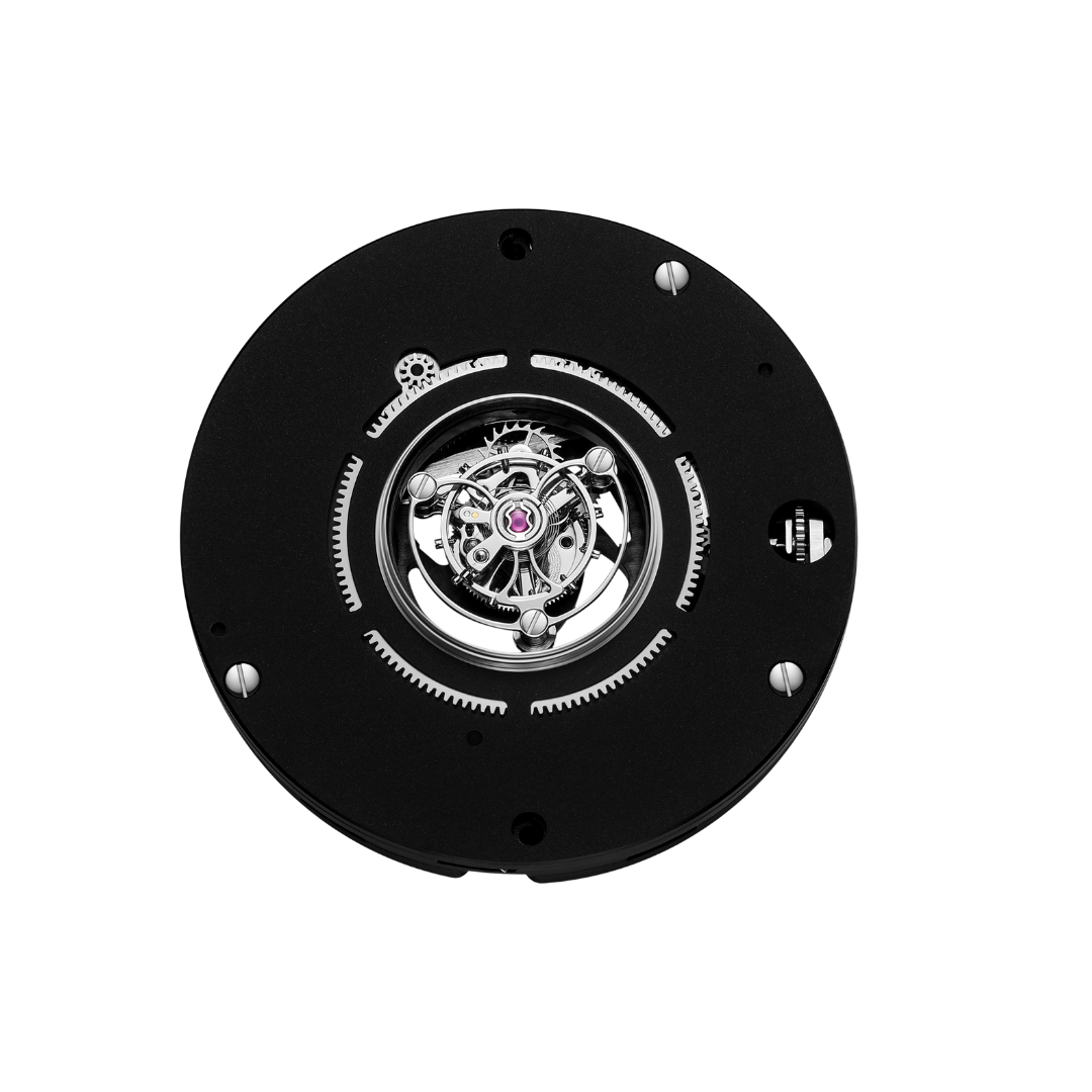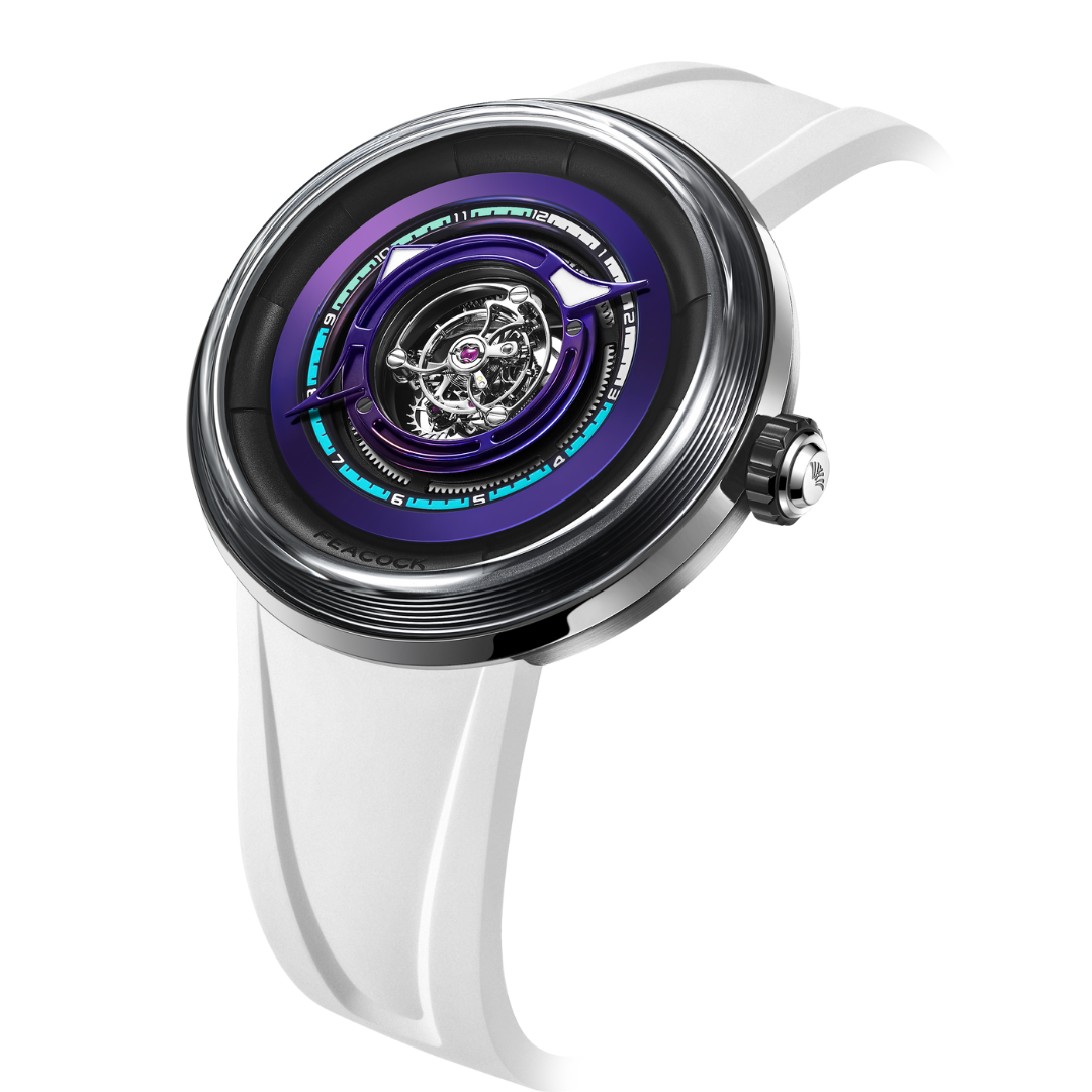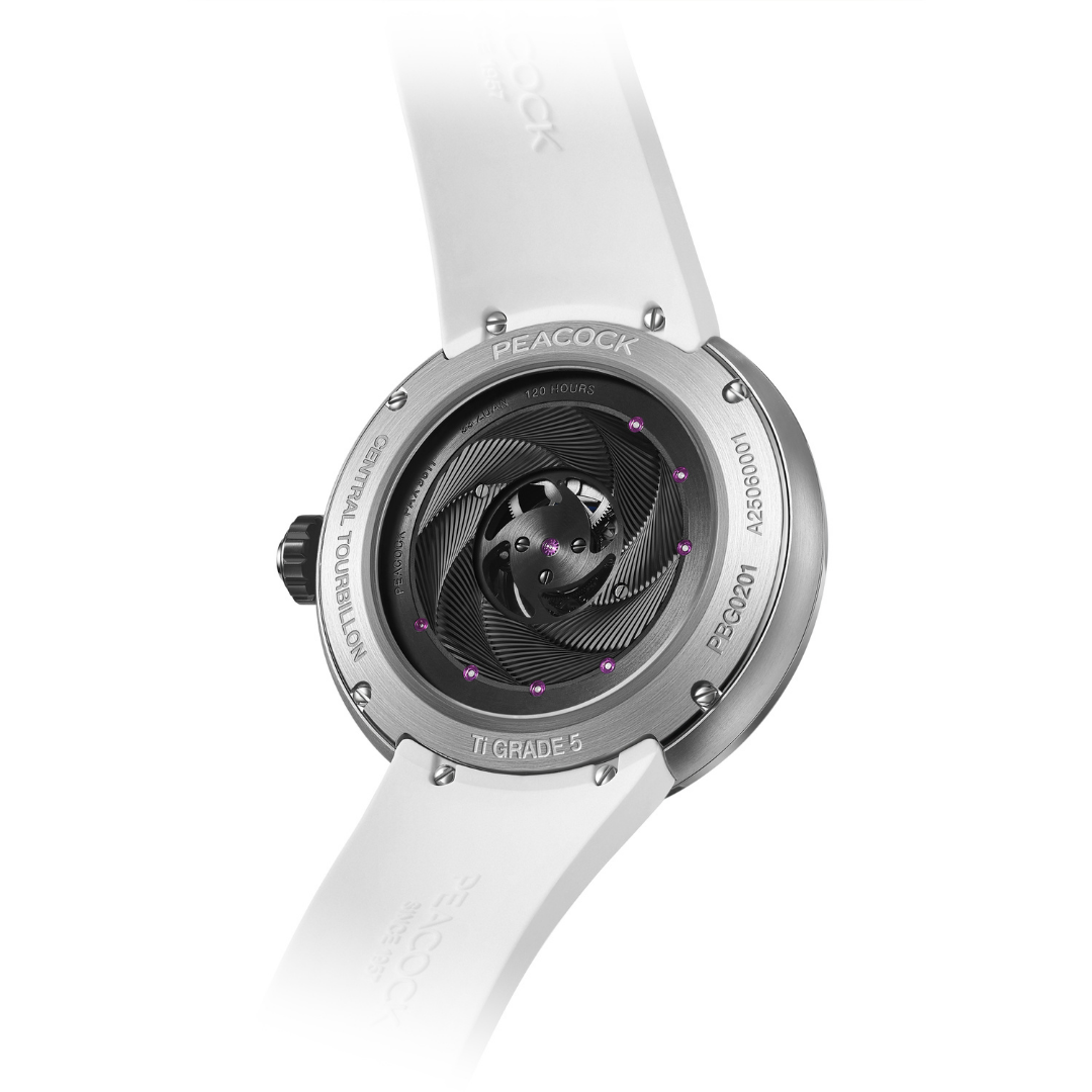 Caliber: Peacock PAX9611 Central tourbillon movement with over 95% transmission efficiency. Four mainspring barrels, 120-hour power reserve